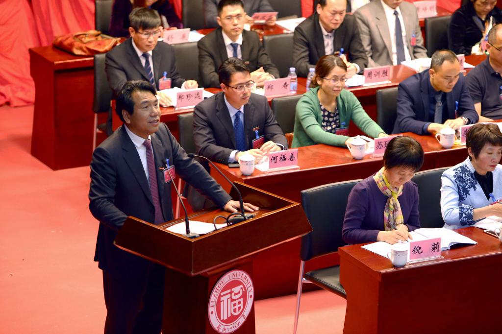 校纪委书记邹毅致开幕词,宣布大会正式开始。会上,付贤智校长作学校工作报告。他回顾了学校2017年的工作,并对福州大学2018年的主要工作作了部署。他表示,2017年福州大学成功入选国家“双一流”建设高校,基本完成东南强校建设目标。2018年是全面贯彻落实党的十九大精神的开局之年,是实施“十三五”规划承上启下的关键一年,是福州大学全面实施“双一流”建设的重要一年,也是福州大学建校60周年。