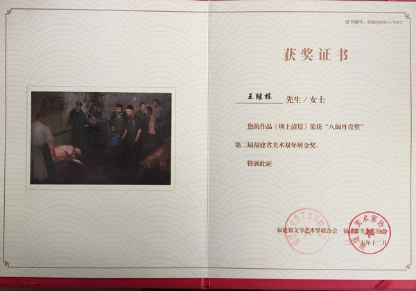 据悉,“八闽丹青奖”为省文联、省美协特设的福建省美术最高奖,旨在进一步发展福建省美术事业,促进和繁荣新形势下的美术创作,展示福建省美术家在美术创作方面的最新成果,推进美术家队伍建设。获金奖作品由组委会收藏,颁发“文联阁”证书,并附收藏费。获金奖作品可直接参加第13届全国美展省选拔展复评,省文联将专门举办金奖及金奖提名奖作者学术提名展。