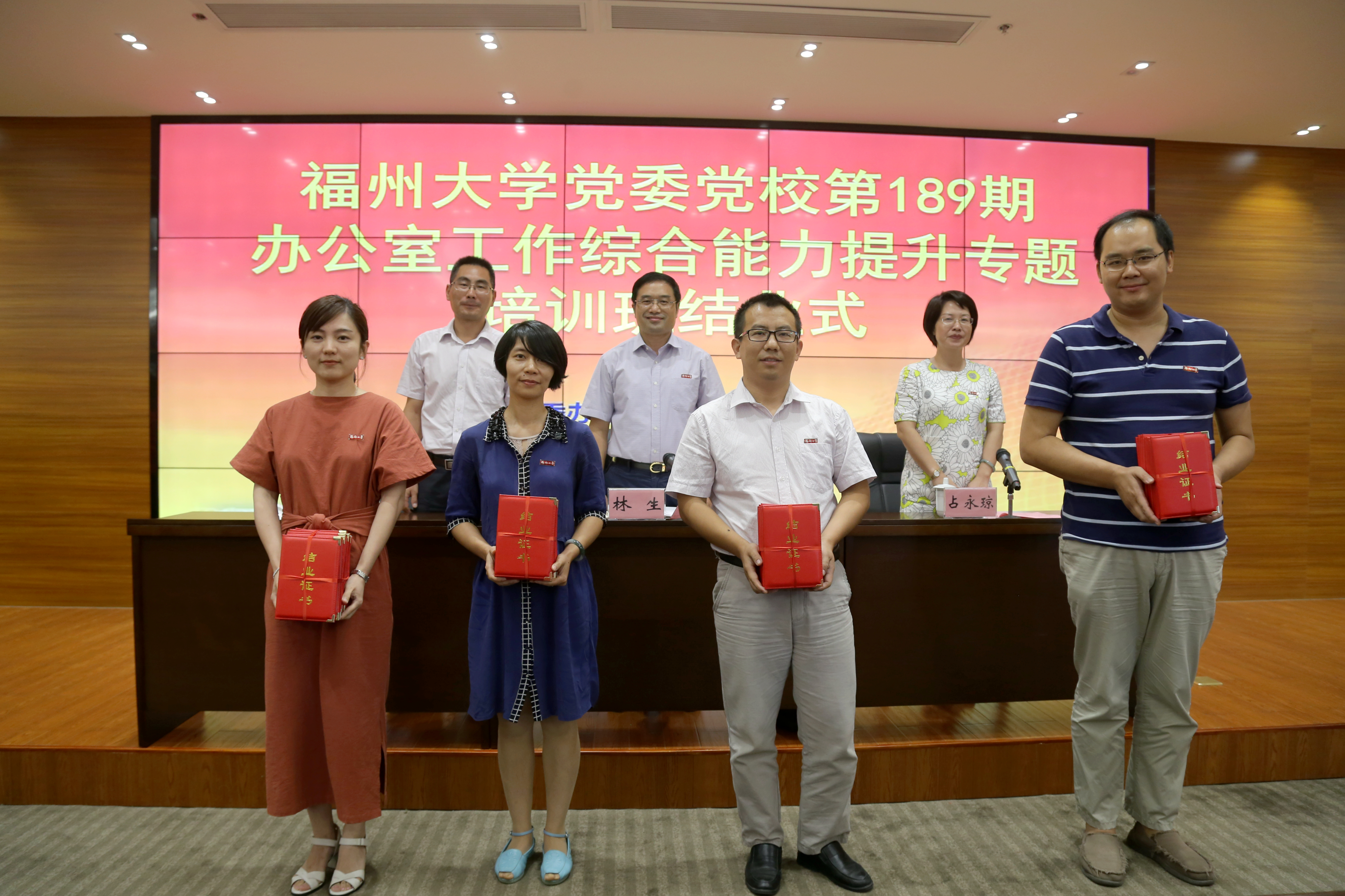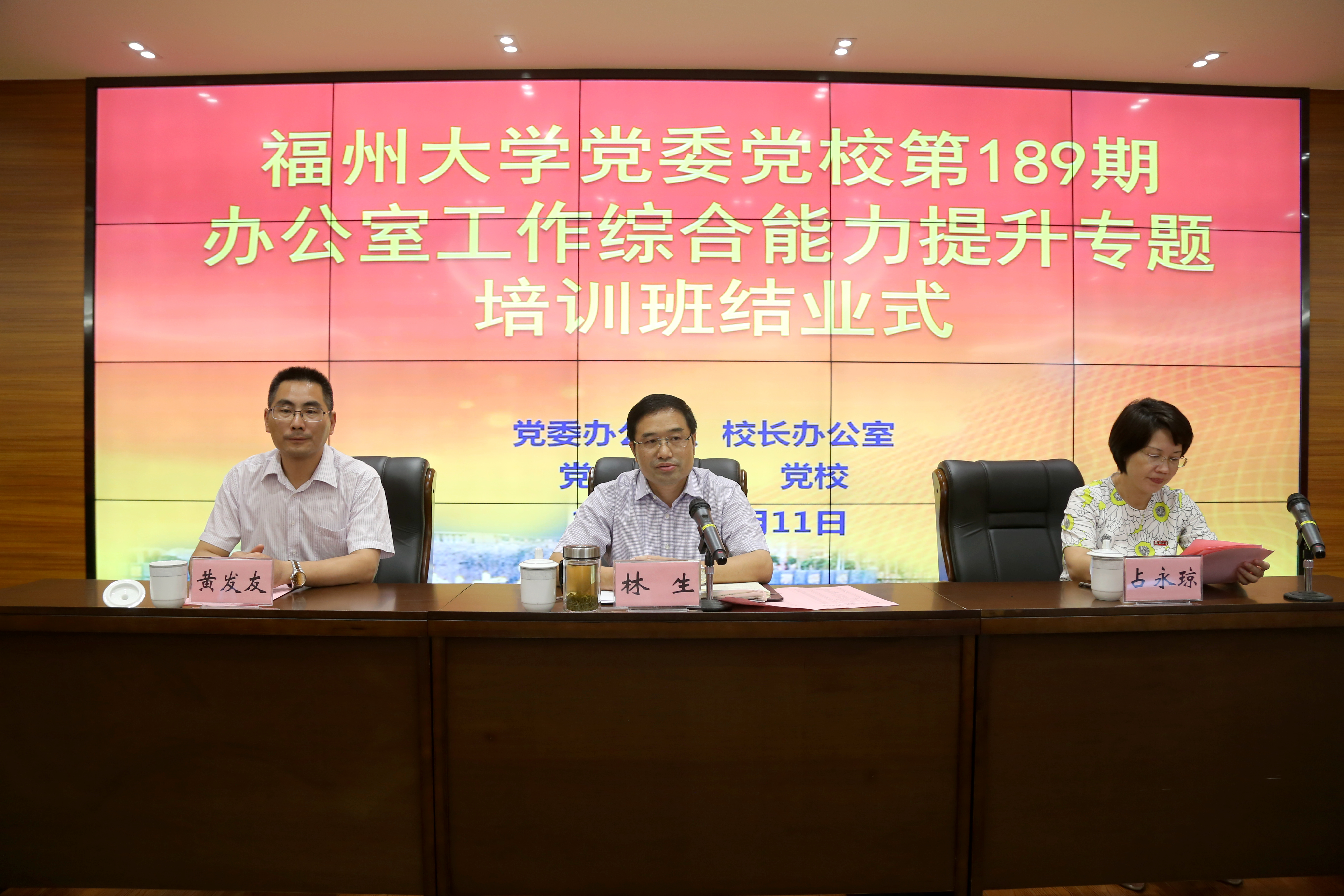 随后,校党委林生副书记为学员代表颁发结业证书并发表了讲话,他首先向参加培训班并顺利结业的所有学员表示热烈祝贺,从培训班举办的目的及意义阐明了办公室主任工作的重要性,他对所有学员提出了五点希望:一要加强理论学习,切实提高政治站位;二要注重团结,牢固树立大局意识;三要强化责任担当,不断提升服务水平;四要践行创新理念,弘扬奉献精神;五要增进廉洁意识,坚定道德操守。最后他强调,办公室主任要以习近平总书记提出的“五个坚持”和“四有”来严格要求自己,今后要继续加强交流学习,提升履职能力,为学校高水平“211工程”大学 和 “双一流”建设作出贡献,以良好的精神面貌和优异的成绩迎接党的十九大胜利召开,为福州大学建校60周年献礼。