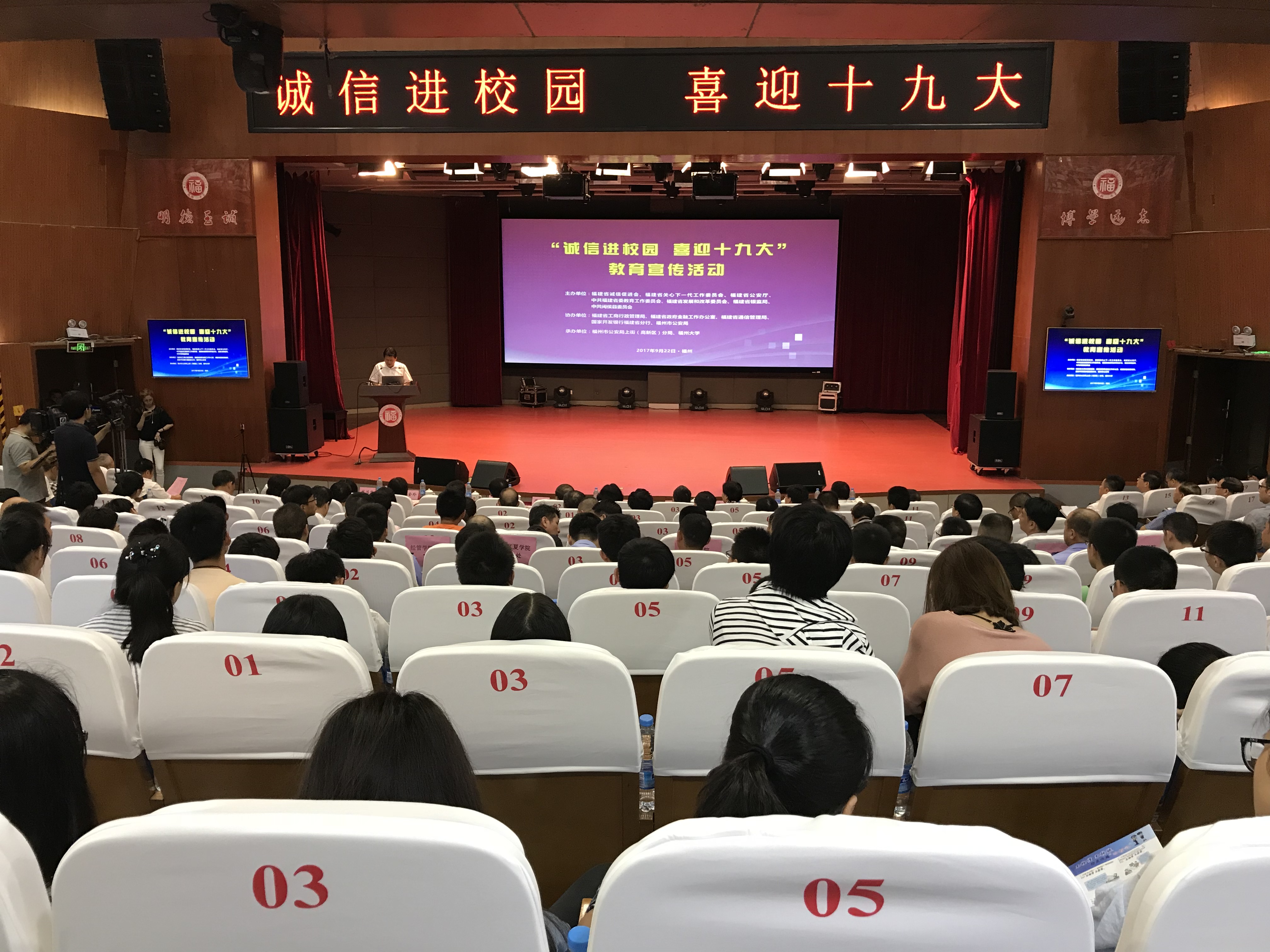 9月22日上午,“诚信进校园 喜迎十九大”教育宣传活动在福州大学图书馆博学厅隆重举行。此次活动由省诚信促进会、省关工委、省公安厅、省委教育工委、省发改委、省银监局、中共闽侯县委联合主办;省工商局、省政府金融办、省通信管理局、国家开发银行福建省分行、福州市公安局协办;福州大学、福州市公安局上街(高新区)分局承办。省人大常委会副主任、省关工委主任刘群英,省人大常委会原副主任、省诚信促进会会长陈伦,省教工委副书记王建南及相关单位领导出席此次活动;大学城相关高校学生处处长、保卫部部长及我校近500名师生代表参加此次活动。活动前,我校党委书记陈永正亲切会见了刘群英副主任和陈伦会长,张星副校长出席活动并致辞。