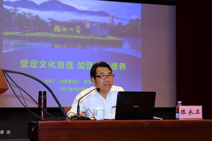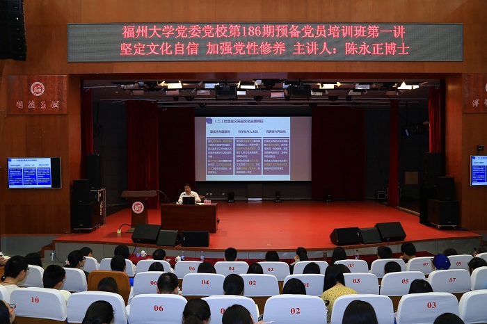 4月20日下午,福州大学党委党校第186期预备党员培训班开班式暨第一讲党课在旗山校区图书馆博学厅举行。校党委陈永正书记为学员们上了一堂题为《坚定文化自信 加强党性修养》的专题党课。
