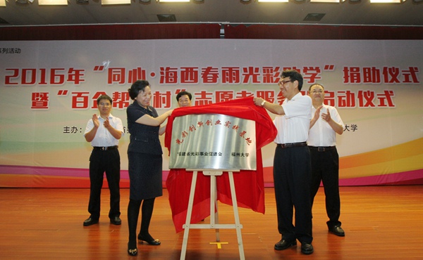 9月13日下午,由省委统战部、省工商联、省光彩会和我校联合主办的“同心·海西春雨光彩助学”捐助仪式暨“百企帮百村”志愿者服务队启动仪式在我校旗山校区图书馆明德厅举办。省委常委、省委统战部部长、省光彩会会长雷春美、省政协副主席杨根生、省工商联主席王光远、省光彩会常务副会长王玲以及我校党委书记陈永正等领导嘉宾出席了捐助仪式。