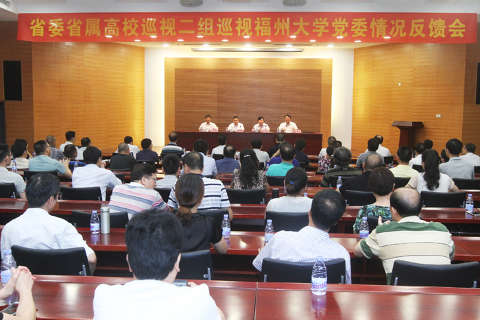 8月15日下午,根据省委的统一部署,省委省属高校巡视二组向福州大学党委反馈巡视工作情况。按照巡视工作程序要求,巡视组分别向学校党委书记和校领导班子反馈情况。在巡视组向校党委陈永正书记反馈巡视情况后,在我校旗山校区行政北楼西325会议室召开了巡视工作情况反馈会。省委巡视办正厅级巡视专员黄伟庆出席反馈会并讲话,省委省属高校巡视二组组长高国跃反馈巡视情况,巡视组其他成员、校党政领导班子成员出席会议。会议由校党委陈永正书记主持。