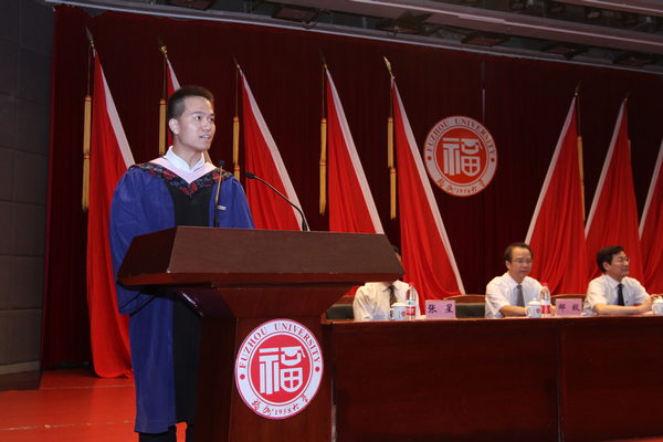 颁 奖仪式结束后,被录取为中山大学博士生的优秀毕业生代表李晓宇同学发言,他用饱含深情的语言表达了对母校师生的感恩和祝福,以及对未来的期待与憧憬。接着,教师代表生物科学与工程学院汪少芸教授发言。汪少芸教授在发言中分享了自己的人生感悟,并希望同学们能为追求梦想不懈奋斗。随后,校长付贤智院士发表 了感情真挚的讲话。付校长在讲话中表达了对同学们的祝贺,并对即将步入社会的毕业生们提出了四点希望:一是希望大家学无止境,臻于至善,树立起终身学习的 意识、养成终身学习的习惯、培养终身学习的能力,从基层做起,从小事做起,在学习中不断增长才干,完善自我;二是希望大家坚持创新,勇于创业,传承福州大 学张孤梅同志等老一辈艰苦奋斗的创业精神和魏可镁院士勇于拼搏的奉献精神,在创新创业中彰显生命的价值; 三是希望大家不忘初心,方得始终,做一个善良、感恩的人做一个正直、踏实的人,做一个有责任、有担任的人,为实现中华民族伟大复兴的中国梦而努力奋斗;四 是希望大家毕业后有空常回母校看看,一如既往地关心、支持母校的建设与发展。