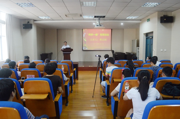 7月1日下午,校党委常委、副校长黄志刚教授在经管院北楼316报告厅为教工党员讲“两学一做”专题党课。机关二各党支部党员、经济与管理学院财金系教工党支部及院机关党支部党员共50多人到场听讲。