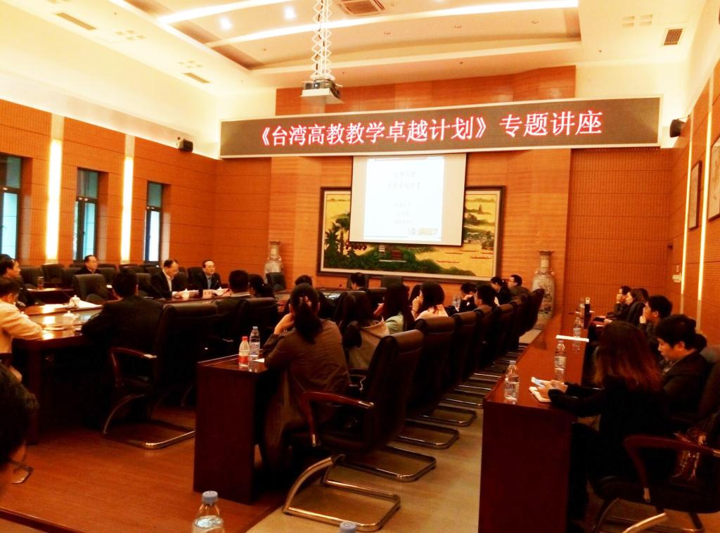 4月15日下午,台湾铭传大学副校长王金龙教授应邀在行政南楼123会议室为我校教学管理人员带来一场题为《台湾高教教学卓越计划》的专题讲座,讲座由王健副校长主持。各学院教学副院长、各专业负责人、教务处相关人员聆听了讲座。这是今年王金龙教授为我校教学管理人员带来的第二场专题讲座,前一场讲座在1月份举办,主题是教学管理信息化。