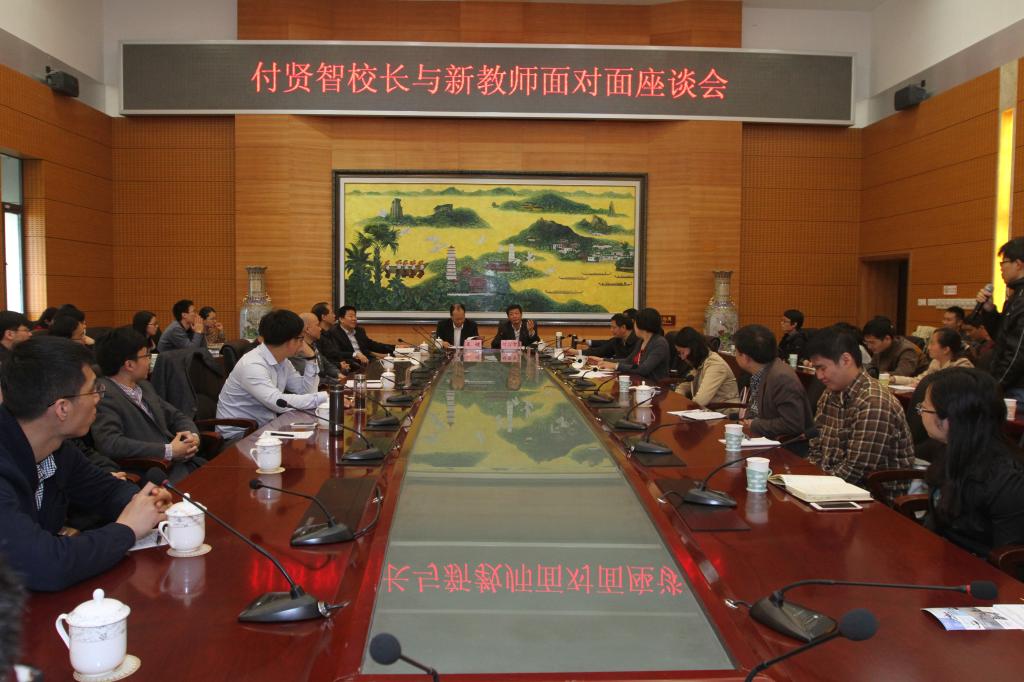4月12日上午,付贤智校长来到行政南楼123会议室与2015年新上岗的89名教师面对面交流座谈,付校长勉励青年教师要热爱教师事业,努力工作,积极作为,勤于学习,善于思考,勇于创新,尽快融入到学校发展事业中,为学校的持续快速协调发展作出积极贡献。王健副校长主持座谈会。教务处、人事处、科技处、基建资产处、后勤处等部门负责人出席了会议。