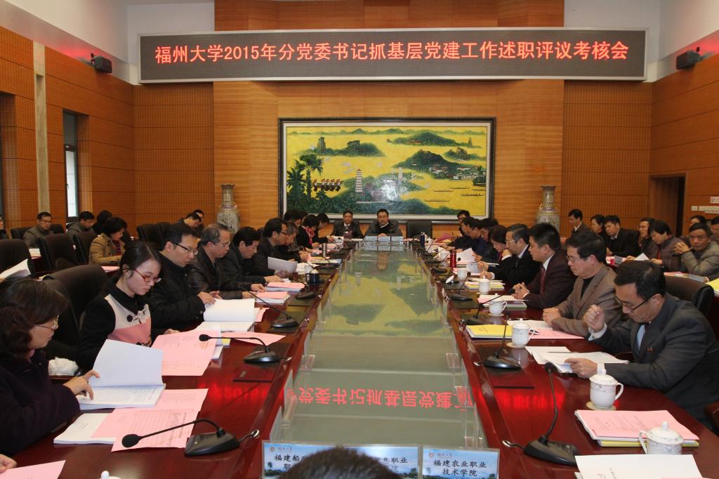 1月15日下午,我校在行政南楼123会议室召开2015年度分党委书记抓基层党建工作述职评议考核会。省委组织部组织处陈球炎副处长、省委教育工委组织处陈洪尧副处长以及7所本科高校和8所高职高专院校代表莅临现场观摩指导。校党委陈永正书记、陈尚义副书记、陈少平副书记、邹毅纪委书记出席会议。校部机关党群部门负责人、全校各分党委书记、校学术委员会委员代表、教师党员代表共计80余人参加会议,会议由陈永正书记主持。