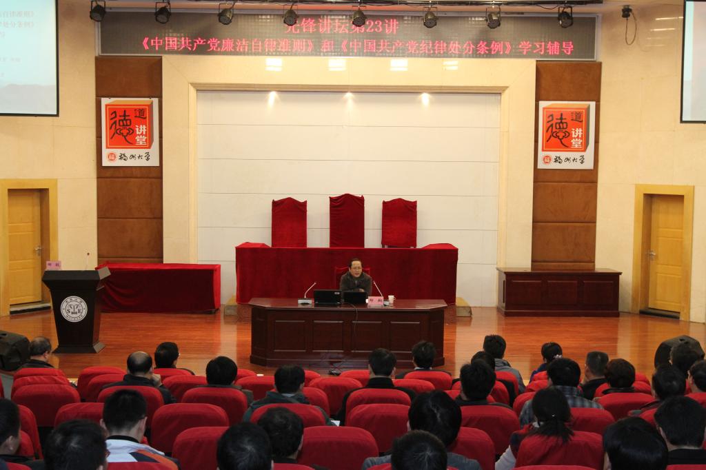 1月22日下午,福州大学先锋讲坛第23讲暨《中国共产党廉洁自律准则》和《中国共产党纪律处分条例》学习辅导会在法学院模拟法庭召开。省纪委省监察厅政策法规研究室主任郑翔应邀作辅导报告。校领导陈永正、陈尚义出席会议。会议由校纪委邹毅书记主持。
