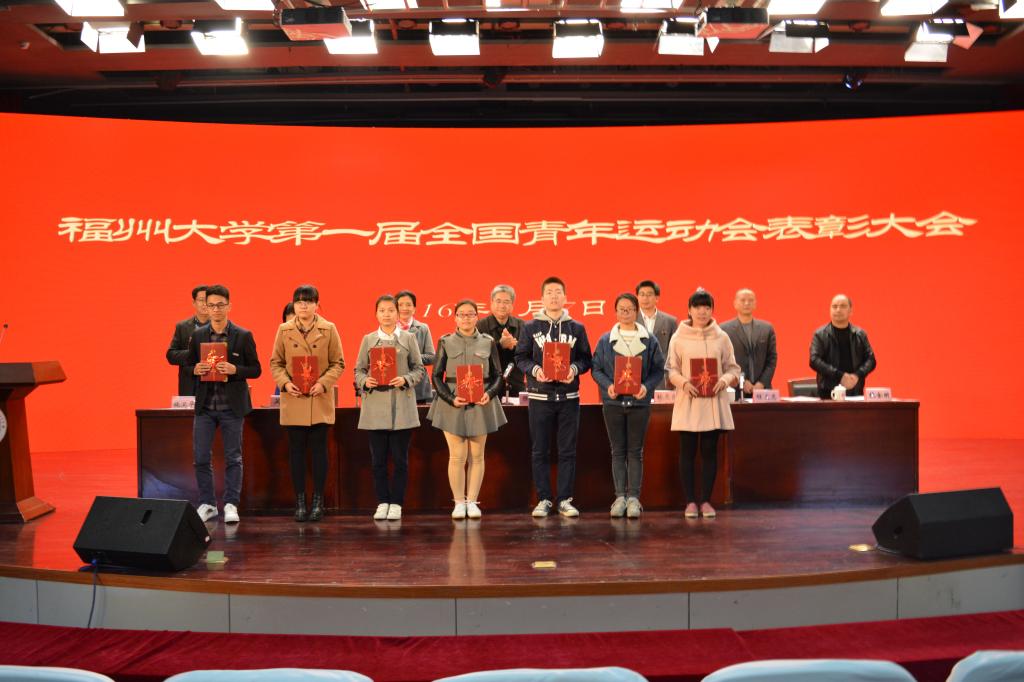 表彰大会以播放的青运会开幕式表演、志愿者训练及演出视频开始,尽展我校学生青春风采,传递福州大学“三种精神”。会上,对我校参加第一届全国青年运动会开闭幕式表演者、赛事志愿者的师生进行了表彰,机械学院的林凯同学和经济与管理学院牛秋月老师分别作为学生代表和带队老师代表发言,分享了他们青运会期间怀抱着青春梦想和志愿激情,积极参与到青运会开闭幕式表演和赛事志愿活动中来的收获和体会。