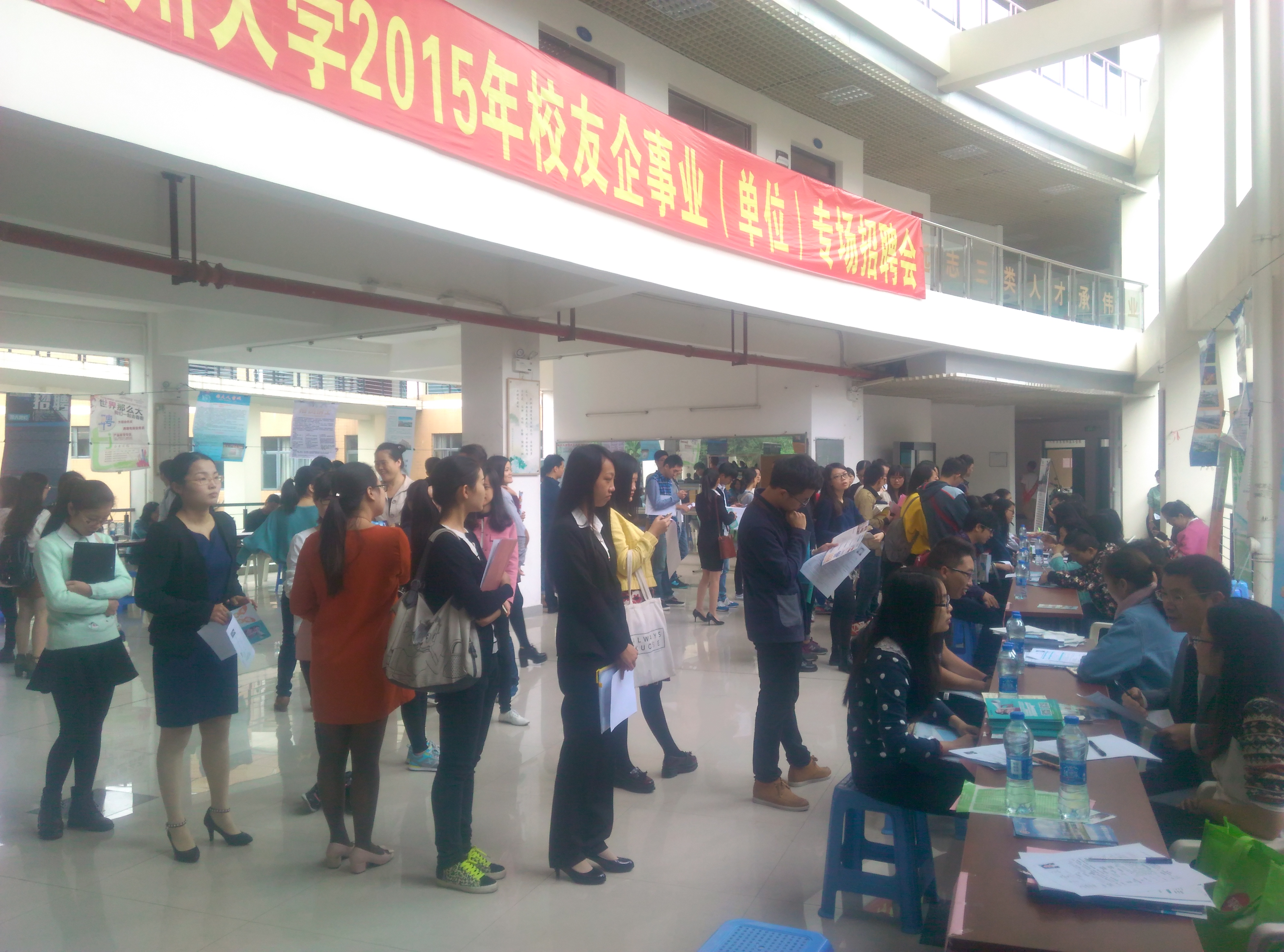11月14日上午,由学生工作部(处)、校友会联合主办的2015年校友企事业(单位)专场招聘会在素拓一楼大厅举办。招聘会邀请了保利(福建)房地产投资有限公司、深圳市市政设计研究院有限公司、阳光保险集团股份有限公司等共计25家校友企业参加,招聘岗位涵盖软件工程、通信工程、市场营销、电气自动化、行政管理、土木建筑等多个专业。招聘会吸引了约1500名毕业生前往应聘,现场人头攒动,气氛热烈。毕业生们就培训机制、未来发展方向等问题向企业HR进行咨询,也希望借此机会对未来的就业方向有更清晰的认识和定位。
