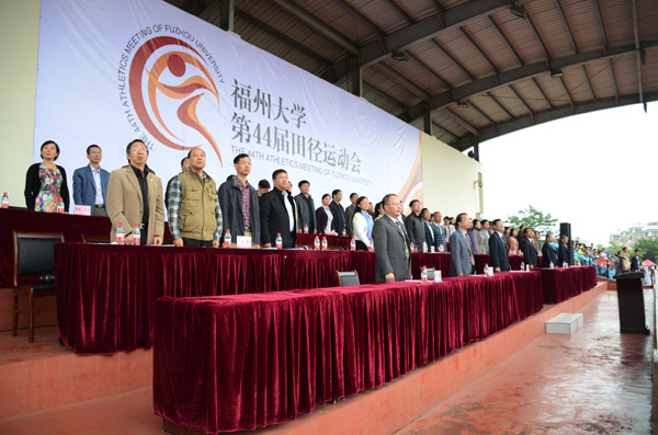 裁判员、运动员代表队入场后,举行升国旗仪式。礼毕,福州大学第44届田径运动会组织委员会主任委员王健副校长致开幕词。王健副校长首先总结了过去一年我校体育工作的成绩,着重强调了我校在刚刚落幕的全国第一届青年运动会中的突出贡献,并预祝运动健儿取得优异成绩。随后运动员代表詹骥同学、裁判员代表赵炜锌老师也先后上台宣誓。