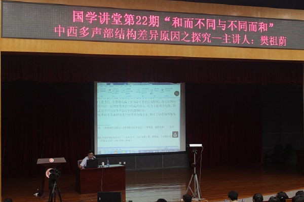 樊祖荫教授的讲座从对中国传统音乐和西方音乐的欣赏讲起,对中国传统多声部音乐的思维特征进行了详细讲解,并跟同学们分享了自己的研究结论:各声部以同一旋律的变体在横向进行时做纵向的叠合,体现了分合相间的线性多声思维特征。然后,樊教授对旋律及其变体声部与织体形态概念所包含的其中织体概念分别举曲谱做了典例分析,并通过对中国传统音乐和西方民歌曲谱的分析讲解了中西和谐观念的异同。最后,樊教授还对“和而不同”观点的来源进行介绍,并提出了“不同而和”的观念:和而不同,不同而和。