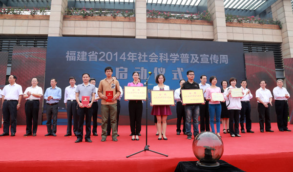 启动仪式上,主办方向全国优秀社科普及基地、全国优秀社科普及读物、优秀社科普及专家、优秀社科普及工作者代表颁发了奖牌和证书,对福建省首批社会科学普及示范点进行授牌,向福州大学等高校和图书馆赠送《福建省社会科学普及条例》单行本和《东南周末讲坛选粹》等科普书籍,并向我省20家单位的社科普及宣传志愿者代表颁发绶带。