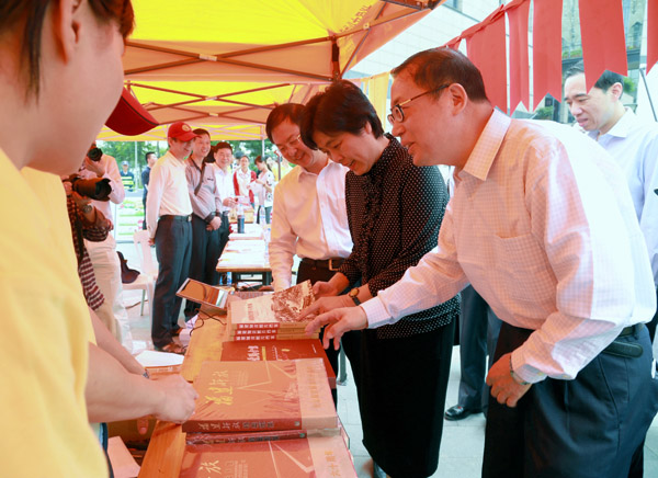 启动仪式结束后,李红副省长和省直有关部门负责人一行在我校校领导的陪同下视察了各省级学会、研究会、协会在图书馆广场开展的我省第十七次“社会科学在你身边”普及咨询活动。我校庆祝建国65周年书画摄影作品展在图书馆一楼走廊同步展出。