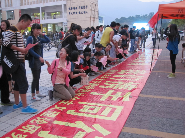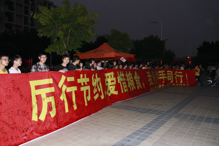 本次宣传教育活动持续两天,活动包括在现场向全校学生分发倡议书、开展问卷调查、主题签名等系列活动。活动中,工作人员在生活区的主要路口、食堂门口向同学们宣传节约理念、分发倡议书;活动还针对学生消费理念、消费情况、浪费现象、解决建议等开展现场问卷调查,大力倡导全校学生知行合一,真正践行“厉行节约,爱惜粮食”的理念;在签名活动中,广大师生纷纷在“珍惜粮食,节约资源,我们携手同行!”的巨型横幅上签下自己的名字。其中法学院2013级法学4班和机械工程及自动化学院2012级机制2班的全体同学参与到活动中来。大家签下的是名字,表达的是决心。
