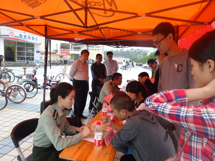 宣讲报告会结束后,相关负责人来到学生生活一区广场,现场开展大学生应征入伍政策咨询会,热心为学生解答各种问题。校党委陈少平副书记莅临政策咨询会现场,和工作人员进行了亲切交流,对我校大学生入伍工作进行悉心指导,并对该项工作提出了指导性意见。
