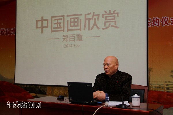 3月22日上午,嘉锡讲坛第358期在行政北楼西325顺利举行。当代著名的中国画家和美术教育家、中国画研究院院长、中国美术家协会会员、中国书法家协会会员、国家一级美术师郑百重先生应邀莅临我校为师生作题为《中国画欣赏》的讲座。福州大学党委陈少平副书记出席活动并为郑百重先生颁发福州大学客座教授聘书,党委宣传部、人事处、团委、人文社会科学学院、建筑学院、物理与信息工程学院等部处、学院领导及师生参加了本次活动。