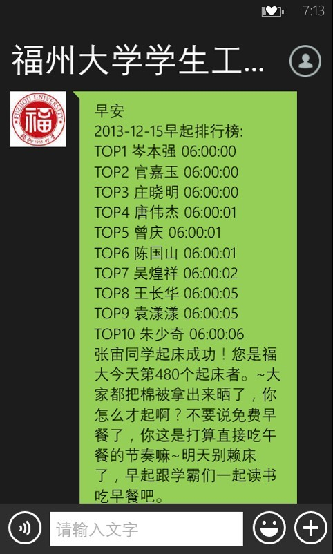 早安福大,促进良好学风。为了培养学生养成良好的学习生活习惯,激发学生学习的积极主动性,营造书声朗朗的校园,一种新颖有趣的微信早安签到方式正悄然走进福大学子之中。晨起读书的学子关注并发送“早安”至福州大学学生工作处微信公众平台,即可收到早起时间排名、随机发送的智力问答及特色叫早提示音,排名前100名的学霸们还可获得由相关赞助单位提供的营养早餐一份,同学们积极参与,体会着晨读的乐趣。