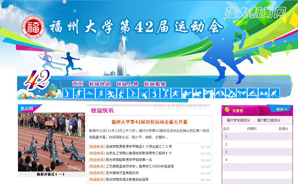 11月14日-16日,福州大学第42届田径运动会将在我校旗山校区一区和三区径场举行。这是我校师生共同关注的一件体育盛事。为了做好校运会的宣传报道工作,我校特地制作了第42届校运会专题网页(网址:http://news.fzu.edu.cn/topic/5.jspx ),如今已经开始上线运行。