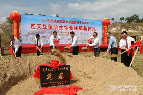 在热烈的掌声与欢呼声中,捐资助学企业家李机能先生、福州大学各领导为连天红留学生综合楼奠下了重要的一锨土。奠下的是善举、是希望、是未来,在场的所有来宾及师生为之欢腾,共同见证了这历史性的一刻。