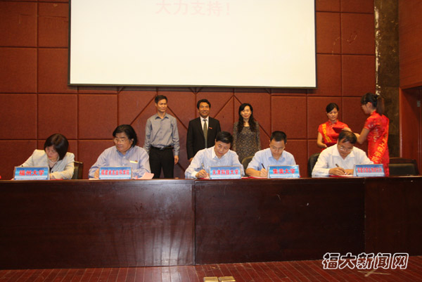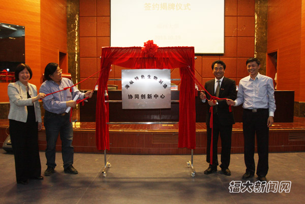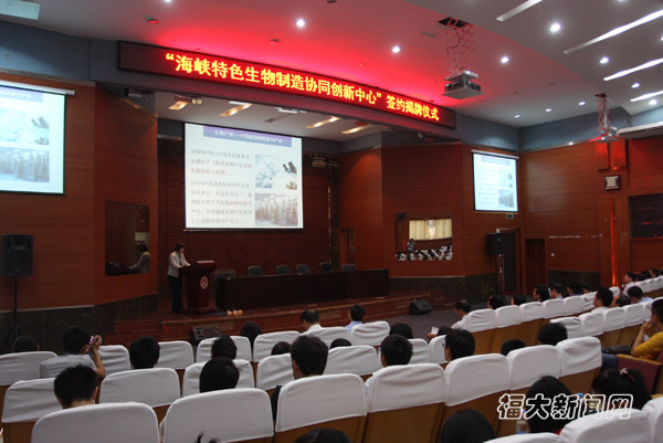 2013年10月19日下午,由我校牵头组建的“海峡特色生物制造协同创新中心”签约揭牌仪式在福州大学旗山校区嘉锡楼一楼报告厅举行。省科技厅、省发改委相关部门领导,各协同单位代表出席签约揭牌仪式。校党委陈永正书记、福州大学“2011计划”领导小组和办公室成员、有关部处负责人、生物科学与工程学院领导以及师生代表出席了大会。仪式由科技处郭太良处长主持。