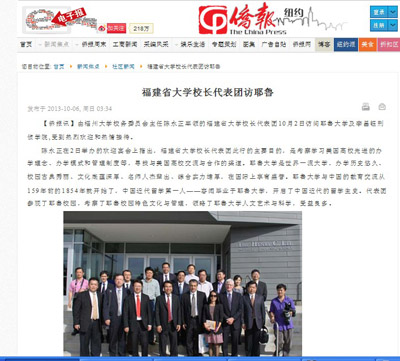近日,以我校党委陈永正书记为团长的福建省大学校长代表团赴美访问世界著名学府耶鲁大学和李昌钰刑侦学院。陈永正书记一行的访问行动受到了美国当地知名媒体《侨报》的热切关注,并以《福建省大学校长代表团访耶鲁》为题进行了大篇幅、图文并茂的报道。与此同时,国内主流媒体人民网和中新网也分别以《福建省大学校长代表团访问耶鲁大学与李昌钰刑侦学院》、《福建省大学校长代表团访问耶鲁大学》为题进行了报道,新华网、凤凰网、搜狐、网易等主流媒体纷纷进行了转载和报道。