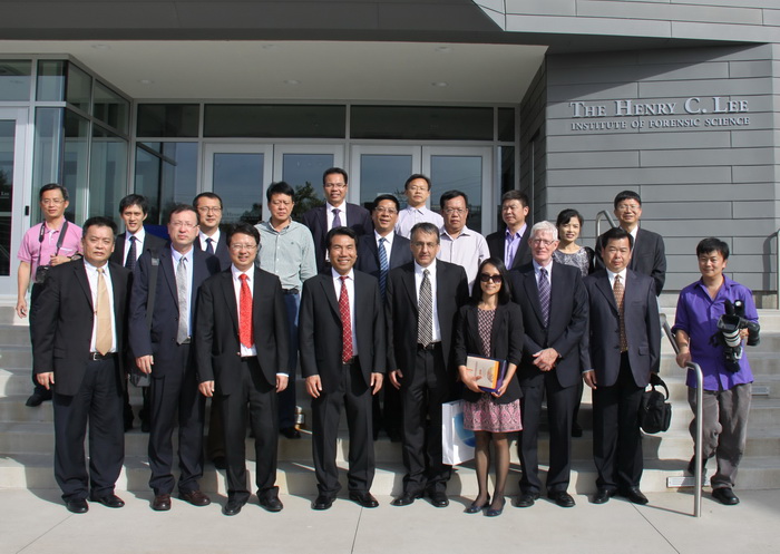 福建省大学校长代表团与纽黑文大学领导和工作人员在李昌钰刑侦学院前合影
