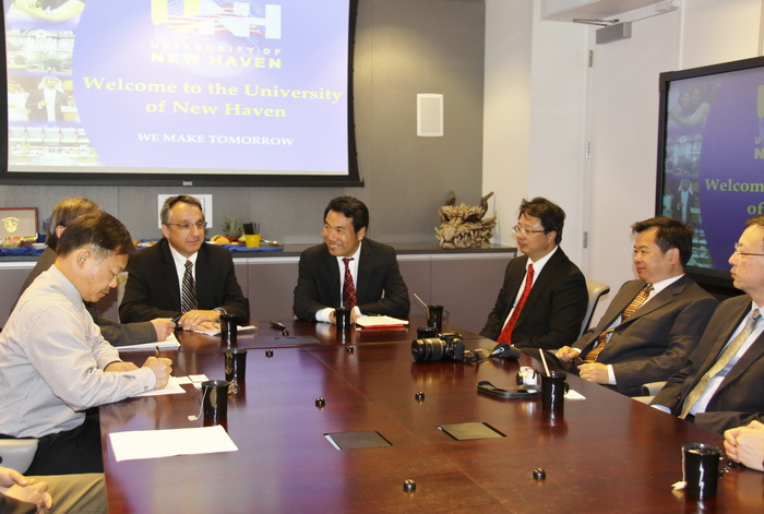 纽黑文大学Daniel May常务副校长和我校陈永正书记首先介绍了各自大学的基本情况。宾主双方就加强教育交流与合作进行了友好深入的会谈,并达成了基本合作意向。纽黑文大学表示:非常愿意和福州大学在相关优势学科领域开展交流,并愿意努力推动两校间开展新课程研发、教师互访、共同学术研究、共同申请国际项目等国际合作。