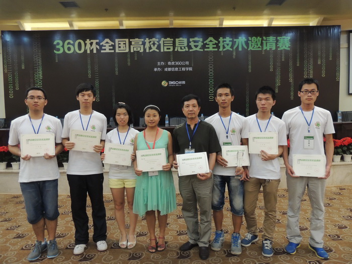 2013年7月30—31日,由奇虎360公司主办、成都信息工程学院承办的“360杯全国高校信息安全技术邀请赛”在重庆举行。在360杯全国高校信息安全技术邀请赛中,我校2个参赛队与来自北京邮电大学、重庆邮电大学、中国公安大学、陕西师范大学、杭州电子科技大学、广州大学、天津理工大学、中国矿业大学、南昌大学、西南科技大学、四川师范大学等全国11个省市、38支高校代表队同台竞技,取得优异成绩。在林柏钢老师、杨旸老师指导下,经过激烈角逐,我校参赛队脱颖而出,共获得一等奖1个、二等奖1个。其中,由刘煜堃、柯妤珏、庄煜东组成的福州大学代表队荣获一等奖,由黄佳佳、田跃、黄振源组成的福州大学代表队荣获二等奖,同时我校获优秀高校组织奖。