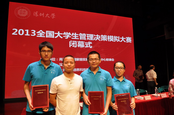 2013年全国大学生管理决策模拟大赛总决赛于2013年7月21日—24日在深圳大学成功举行,本次大赛由教育部高等学校国家级实验教学示范中心联席会主办,深圳大学承办。我校代表队“三个臭屁匠” 队(由管理学院10级市场营销专业本科生刘建辉(司职CEO)、2010级电子商务专业本科生颜媛媛(司职市场总监)、2011级国际经济与贸易专业本科生王灿龙(司职财务总监)和指导教师陈朝晖老师组成)最终位列总决赛第11位,获得一等奖。