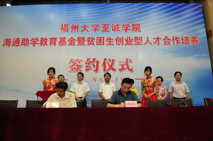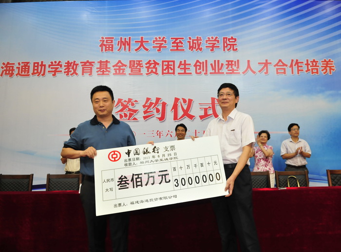 仪式上,福建海通集团林成国董事长与至诚学院吴秋明院长代表双方签订协议。根据协议,双方将在有志于创业的贫困大学生中遴选同学组成“贫困生创业型人才实训班”,由至诚学院负责创业理论相关课程的教学和强化训练,福建海通集团负责实务训练。通过发挥校企双方优势,切实帮扶贫困大学生创业,培养造就更多创业型人才。此外,福建海通集团还捐资300万元设立了福州大学至诚学院海通助学教育基金,用于资助贫困大学生、奖励品学兼优的明星学生和在学科竞赛中取得突出成绩的学生个人或团体,支持培养高素质创新创业应用型人才。校党委陈尚义副书记代表至诚学院接受了捐赠。