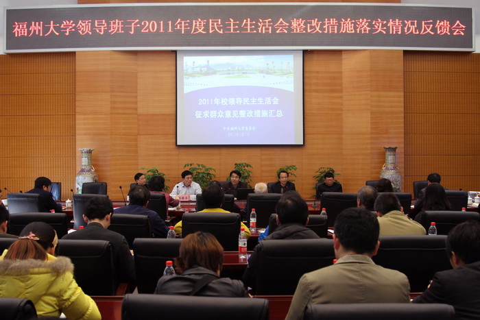 3月7日,我校在行政南楼123会议室召开福州大学领导班子2011年度民主生活会整改措施落实情况反馈会。校党委陈永正书记出席会议并对整改落实情况和2013年学校工作要点进行通报。会议由校党委常委、纪委邹毅书记主持。