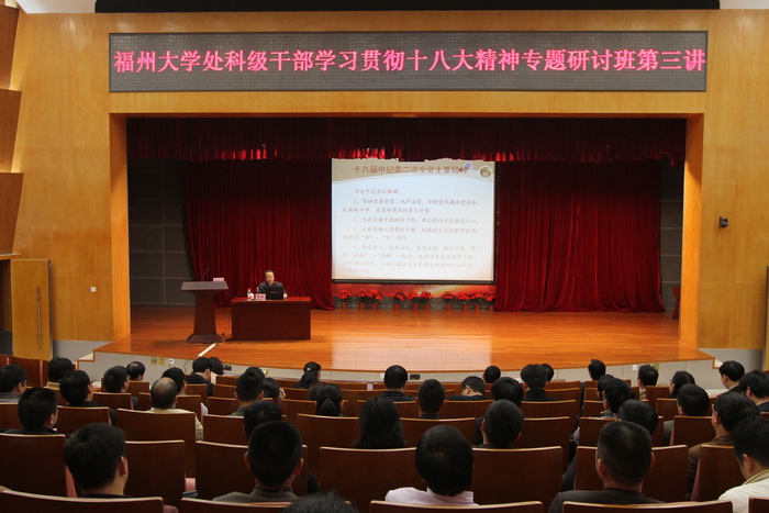 3月6日下午,处科级干部学习贯彻十八大精神专题研讨班第三讲暨福州大学“先锋讲坛”第七讲报告会在我校旗山校区图书馆明德厅举行。校党委常委、纪委邹毅书记作《学习贯彻党的十八大精神,扎实推进学校党风廉政建设》的专题报告,校党委组织部徐晓丹部长主持报告会,全校处科级干部参加了报告会。
