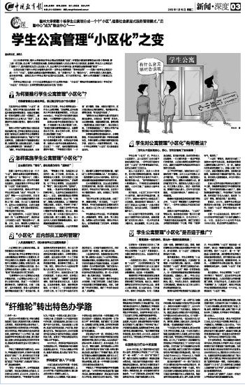 1月15日,《中国教育报》在第三版新闻深度版,以四分之三的大篇幅对我校后勤学生公寓管理小区化的新思路新做法进行深度报道,在社会上引起较大反响。