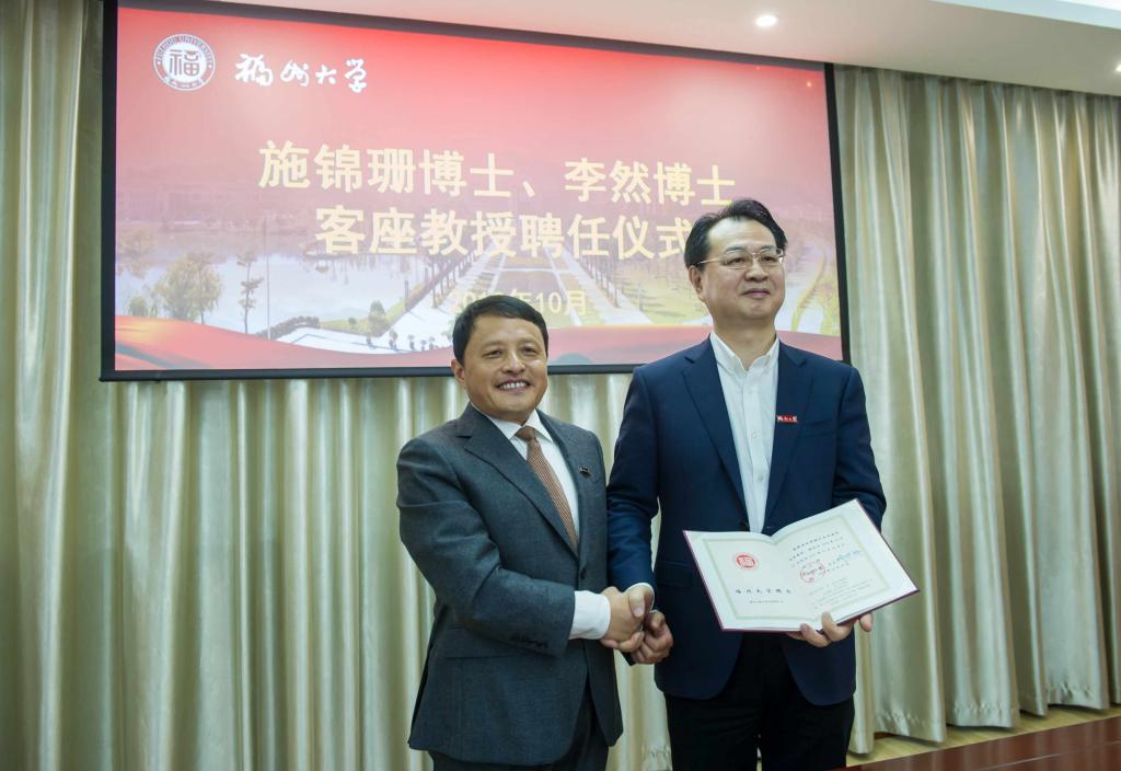 在学校领导、嘉宾和学生代表的共同见证下,施锦珊博士与福州大学教育发展基金会代表进行签约。张星副校长代表学校向施锦珊博士、李然博士颁发客座教授聘书,佩戴教师校徽。