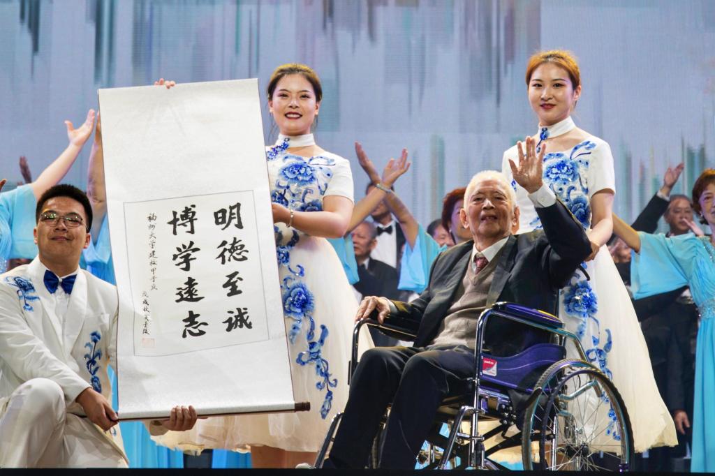 黄金陵老校长带来亲笔书写的校训“明德至诚·博学远志”