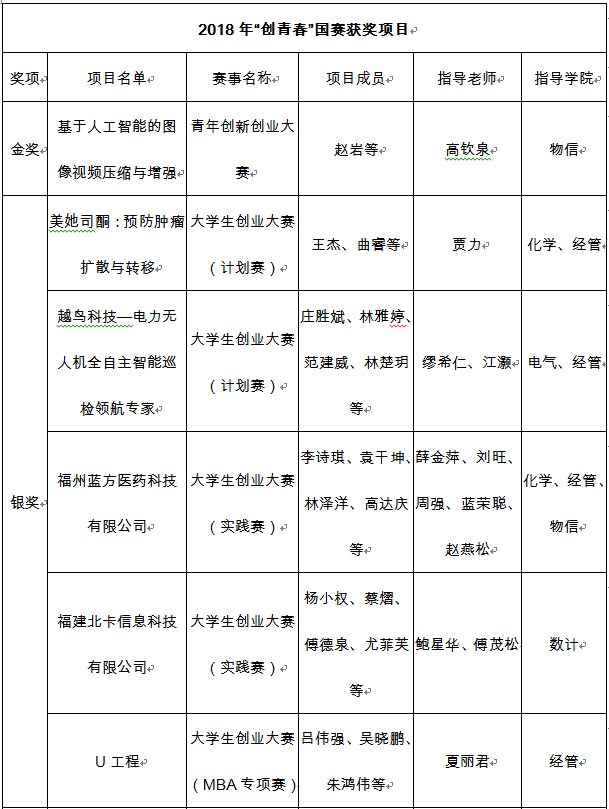 新闻中心讯/11月3日,随着“创青春”浙大双创杯全国大学生创业大赛在浙江大学落下帷幕,2018年“创青春”系列的国家级赛事全部结束。福州大学各项赛事中共获得1金5银4铜的历年最好成绩。其中,福州大学首次有项目晋级创业计划赛(2项)、创业实践挑战赛(2项)和MBA专项赛(1项)的全国总决赛,实现了突破。