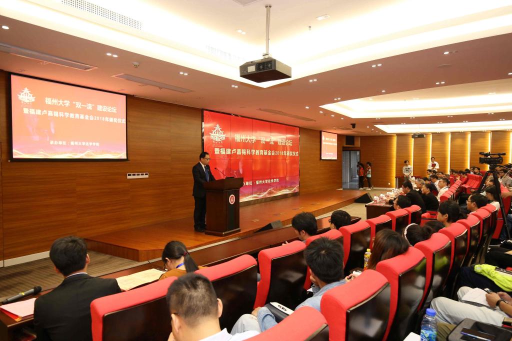 新闻中心讯/10月27日下午,在科技园一楼报告厅,福州大学“双一流”建设论坛暨卢嘉锡科学教育基金会2018年度颁奖仪式举行。仪式由化学学院院长王心晨教授主持。